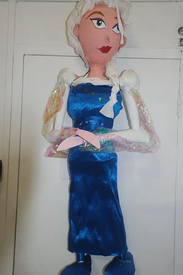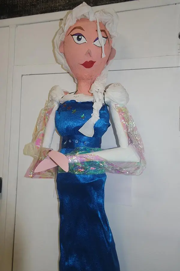 C’est l’occasion, avec cette superbe pinata Elsa, reine des neiges. Elle est fabriquée localement, à Montpellier, à la main, à base de carton et de papier crépon.